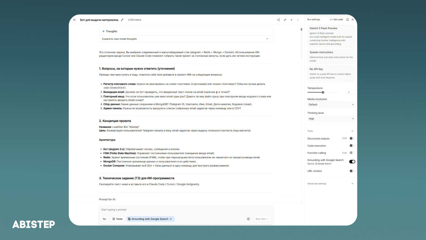 Именно такой порядок оказался критически важным. Одна из самых частых ошибок новичков — сразу просить ИИ «написать бота». С таким подходом получить адекватный результат гораздо сложнее.