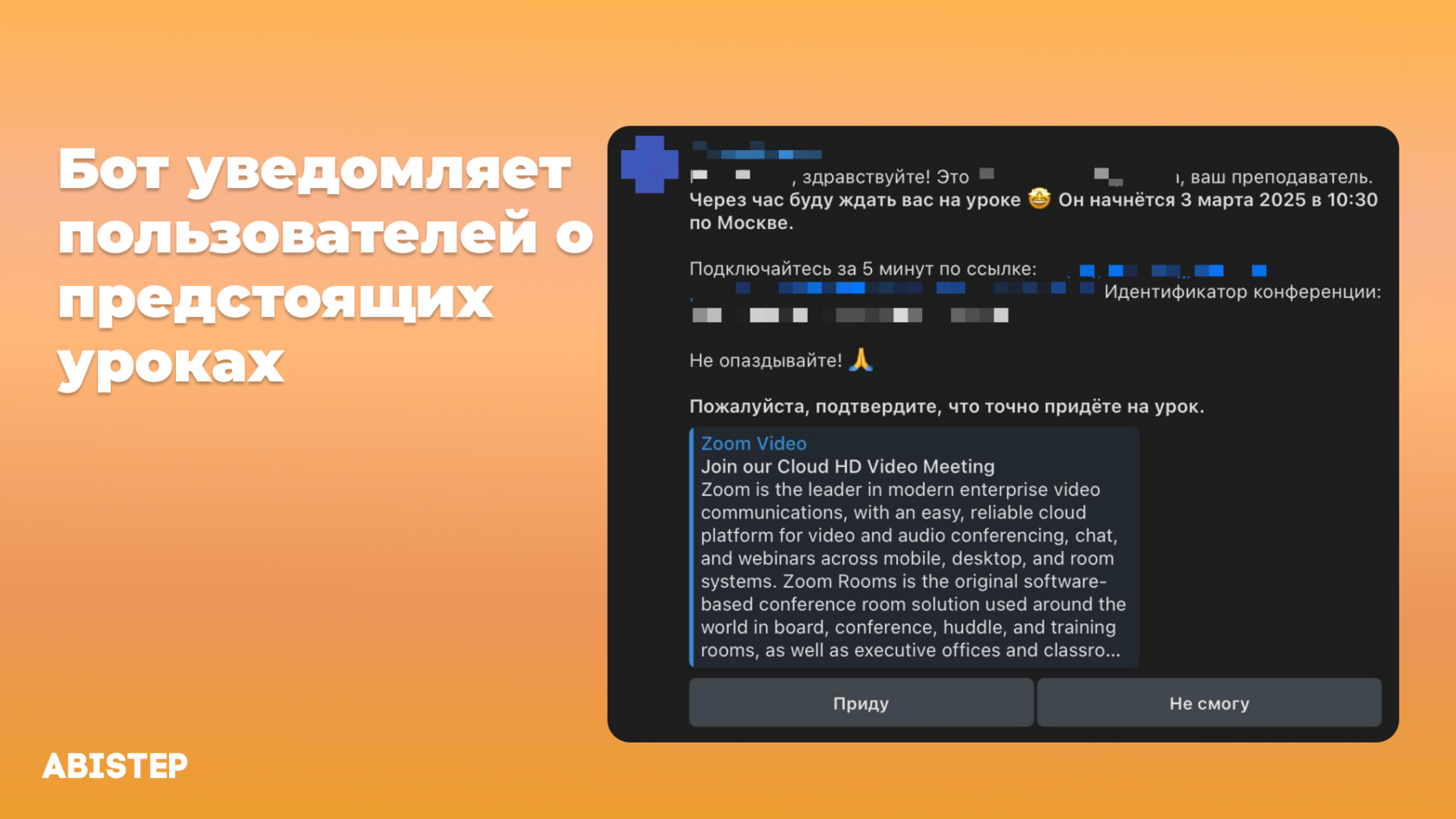 AI-бот сам предлагает свободные слоты, бронирует время в календаре, отправляет напоминания и даже переносит встречи по запросу.